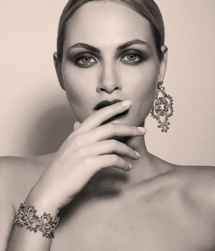 Our experience in luxury knitwear design and our love for the elaborate, fine and delicate quality of lace, made us create this contemporary, stylish, sophisticated and feminine jewellery line.