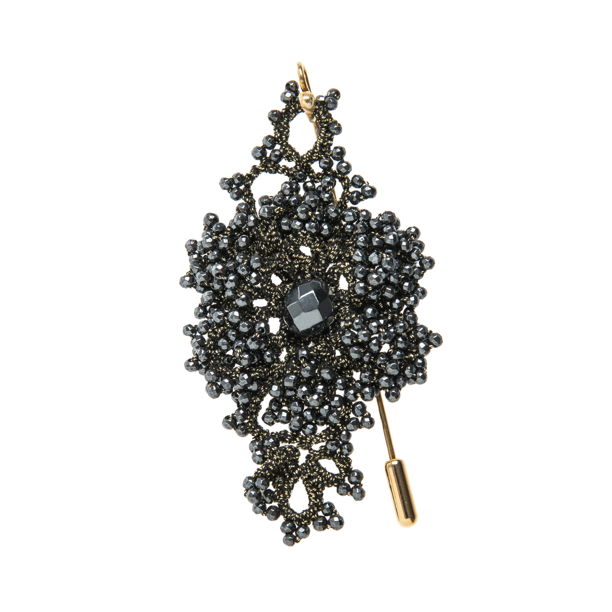Callista brooch is intricately hand~laced using metallic, silk threads & sparkling natural healing gemstones.